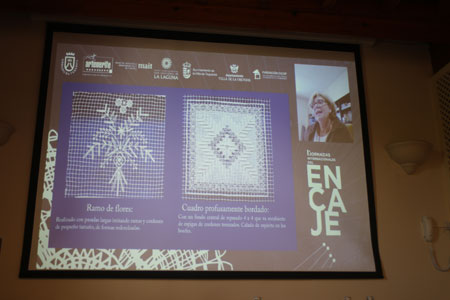 Rosanna était accompagnée de Nathalie, l'interprète. Seules les conférences en Français étaient traduites en espagnol. Il avait été demandé à Rosanna de présenter la dentelle de Valenciennes, sujet qu'elle maitrise parfaitement puisqu'elle a débuté la dentelle avec cette technique en 1990. C'était d'ailleurs des débuts un peu bizarres car habituellement on commence par la dentelle torchon !