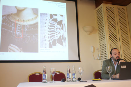 Rosanna était accompagnée de Nathalie, l'interprète. Seules les conférences en Français étaient traduites en espagnol. Il avait été demandé à Rosanna de présenter la dentelle de Valenciennes, sujet qu'elle maitrise parfaitement puisqu'elle a débuté la dentelle avec cette technique en 1990. C'était d'ailleurs des débuts un peu bizarres car habituellement on commence par la dentelle torchon !