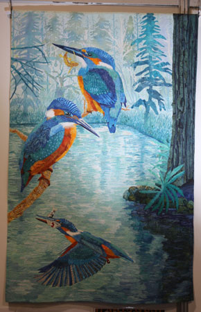 Toujours de Karen Milne, "Le matin magique" représente une scène où trois martins-pêcheurs pêchent au petit matin au-dessus d'une rivière avec une forêt en arrière plan. Il y a beaucoup de fils pailletés, de tissus et de peinture pour simuler la réflexion de la lumière.