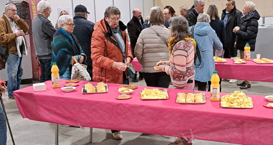 L'inauguration a lieu le vendredi soir. L'apéritif était une dégustation des vins d'Anjou proposée par le domaine de la Ducquerie de Val du Layon avec du blanc sec, du vin moelleux et du vin rouge. Comme la vigneronne était seule, avec Patrick de l'organisation, pour servir Rosanna est passée derrière la table pour servir les exposants assoiffés !
