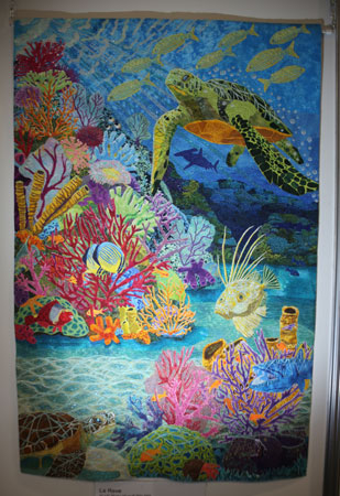Beaucoup d'artistes en art textile, en quilts en peinture à l'aiguille avaient installé leurs oeuvres dans la salle attenante à la salle principale des commerçants et artisans. En détail de la photo de gauche "L'esprit du vent" Chevaux de Camargue réalisé en quilt.